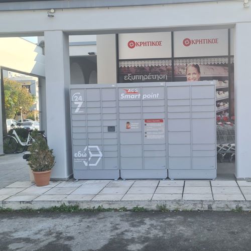Προσέλθετε στο κατάστημα Κρητικός επί της οδού Αλ. Παπαναστασίου. To ACS Smartpoint Locker βρίσκεται στον εξωτερικό χώρο του καταστήματος.