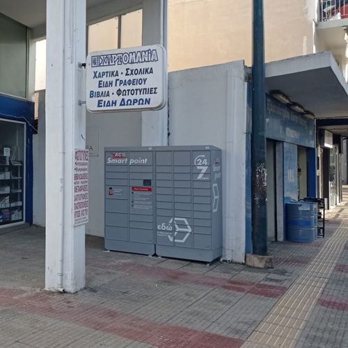 Προσέλθετε στο κατάστημα "Χαρτομανία" επί της οδού Σικάγου 21. To ACS Smartpoint Locker βρίσκεται στον εξωτερικό χώρο του καταστήματος.