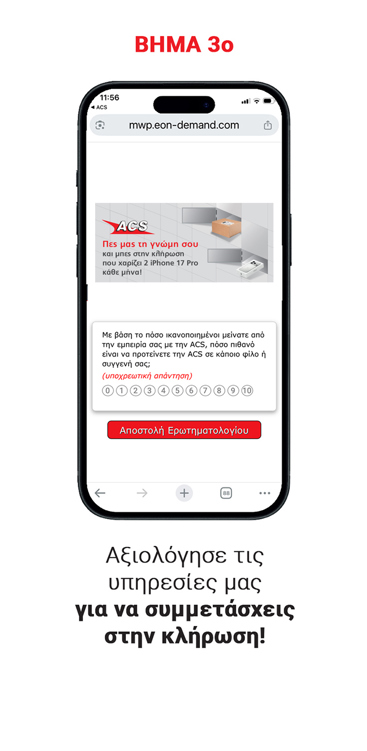 Από 5 Μαρτίου έως 30 Νοεμβρίου 2026, η ACS σου δίνει την ευκαιρία να κερδίσεις ένα από τα 2 iPhone 17 Pro που κληρώνονται κάθε μήνα, απλά αξιολογώντας την εμπειρία σου από τις «My favourite ACS Locker» παραλαβές σου μέσα από το ACS Mobile App.