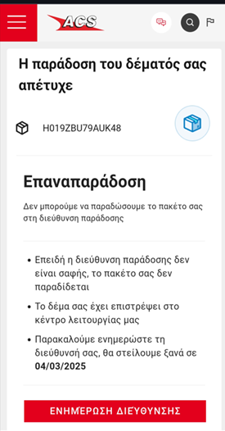 - Ελέγξτε στην ψηφιακή μας βοηθό που θα βρείτε στο site μας: www.acscourier.gr και στο ACS Mobile App, ότι ο αριθμός αποστολής που αναφέρει το μήνυμα είναι υπαρκτός. Συνεχίστε στην ψηφιακή μας βοηθό για οποιαδήποτε ενέργεια επιθυμείτε σχετικά με την αποστολή σας, πχ προσθήκη οδηγιών παράδοσης.