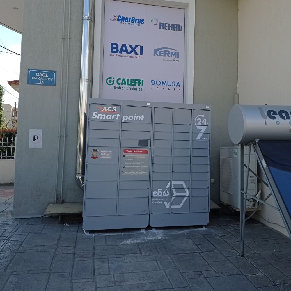 Arrive at Racor store on 96 Iraklitou Street. The ACS Smartpoint Locker is located to the left of the main entrance, outside the store.