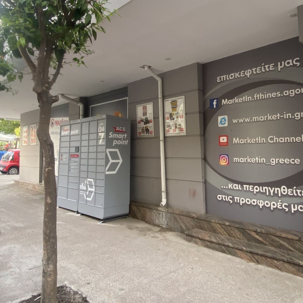 Arrive at Market In store on Averoff and Korai 16 streets. The ACS Smartpoint Locker is located in the outdoor area, on the side of the store on Korai street.
