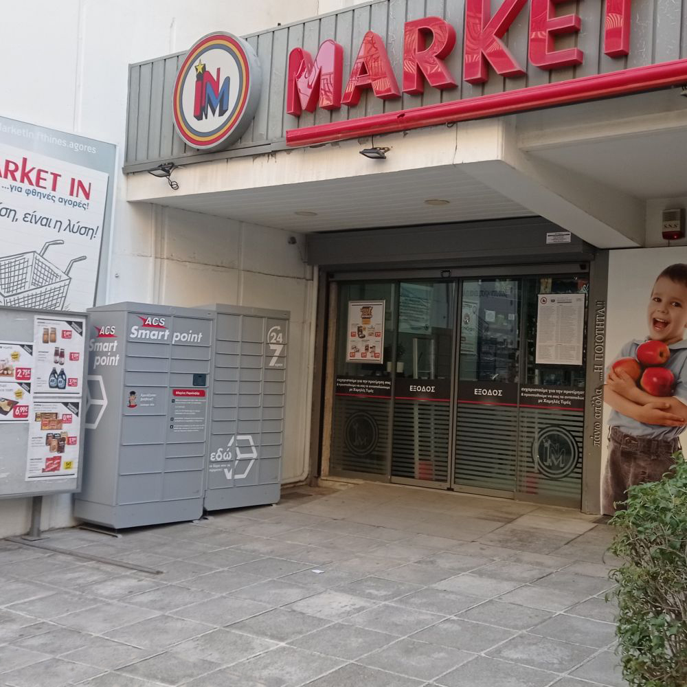 Arrive at "Market In" on 60 Sevasteias street. The ACS Smartpoint Locker is located on the left of the store's main entrance.