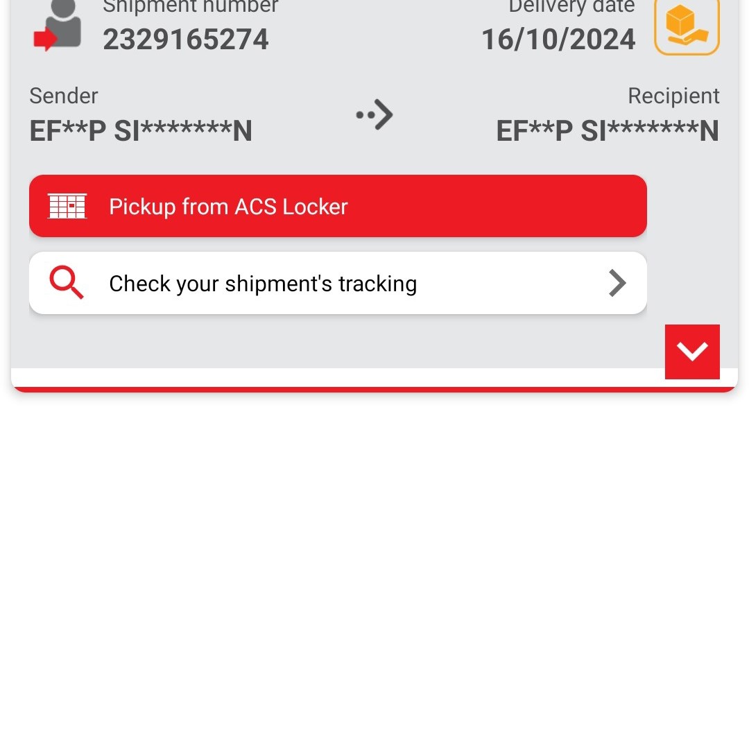 The pickup of the shipment can only be completed via the ACS Mobile App registered with the mobile phone number that is linked with the shipment. Additionally, sharing information about your shipment with other people is not recommended by ACS, for security reasons. ACS S.A. will not be held responsible if the delivery is completed by another person.