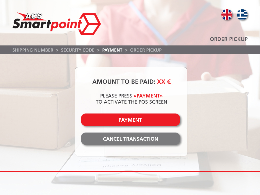 In case you have chosen the cash on delivery service, press "PAYMENT" on the relevant screen and swipe your card (Visa or Mastercard) at the POS terminal.